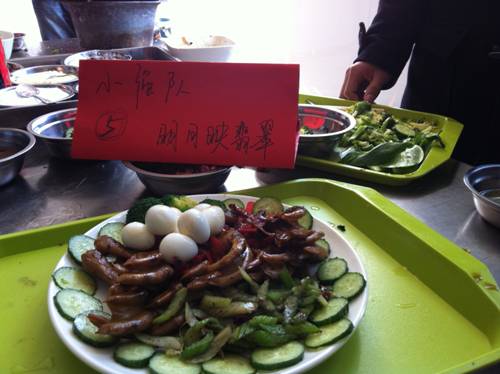 本次赛事共有超过二十支队伍参加,俗话说:巧妇难为无米之炊。所以在比赛开始前,各个参赛队伍便开始进入食堂蔬菜,肉类储藏室进行食材的挑选以及洗,切等。经过一系列的准备之后,比赛正式开始。首先展示比赛作品是“扬州炒饭”,在阳光的照耀下,更显油光四射,评委的表情毋庸置疑的证实了它的美味。同时展出的菜肴还有“冰糖雪梨”“可乐鸡翅”“阿婆水饺”“群龙夺珠"“明月映翡翠”等。最终,大赛评委通过对菜品色泽外观、口感味道、特色创意及健康营养等方面的综合评定,分别评选出一等奖二等奖三等奖数名。“明月映翡翠”以独特的菜名,美味可口荣获了本次大赛的一等奖。比赛在欢声笑语中落下了帷幕,同学们在整个活动过程中都是充满笑容,感受了厨艺带来的乐趣。