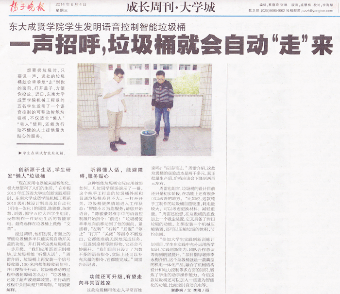 【扬子晚报】东大成贤公司员工发明语音控制智能垃圾桶