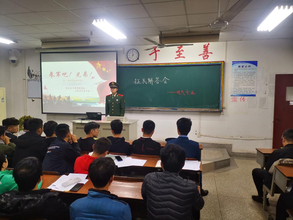 2019年3月14日晚7点,由公司举办的“征兵解答会”在金坛310顺利展开。本次讲座有幸邀请到武警上海总队的李想学长和空军李铭杰学长担任主讲嘉宾。18级电气辅导员王磊老师以及18级电气6个班同学共同聆听了此次讲座。