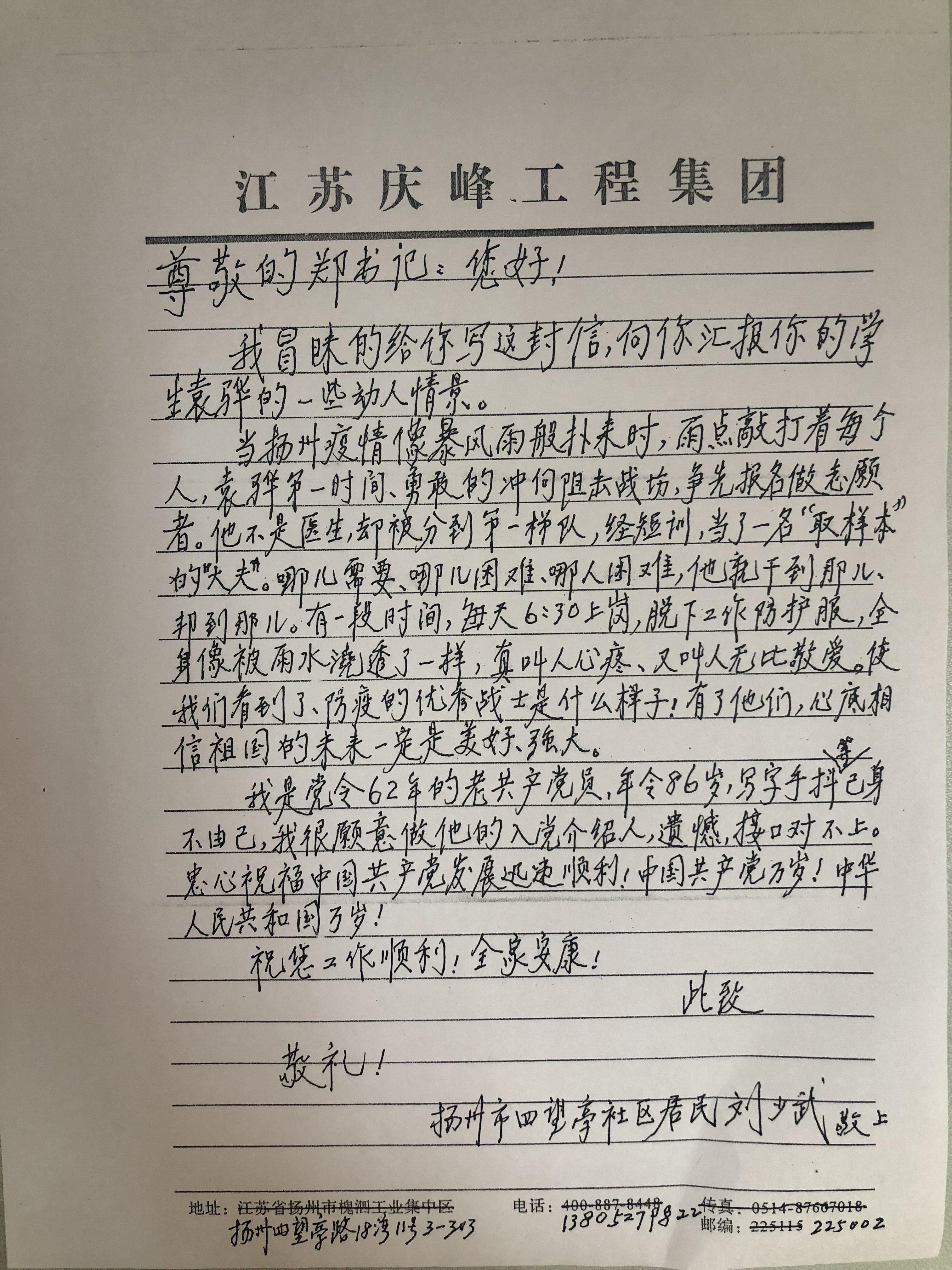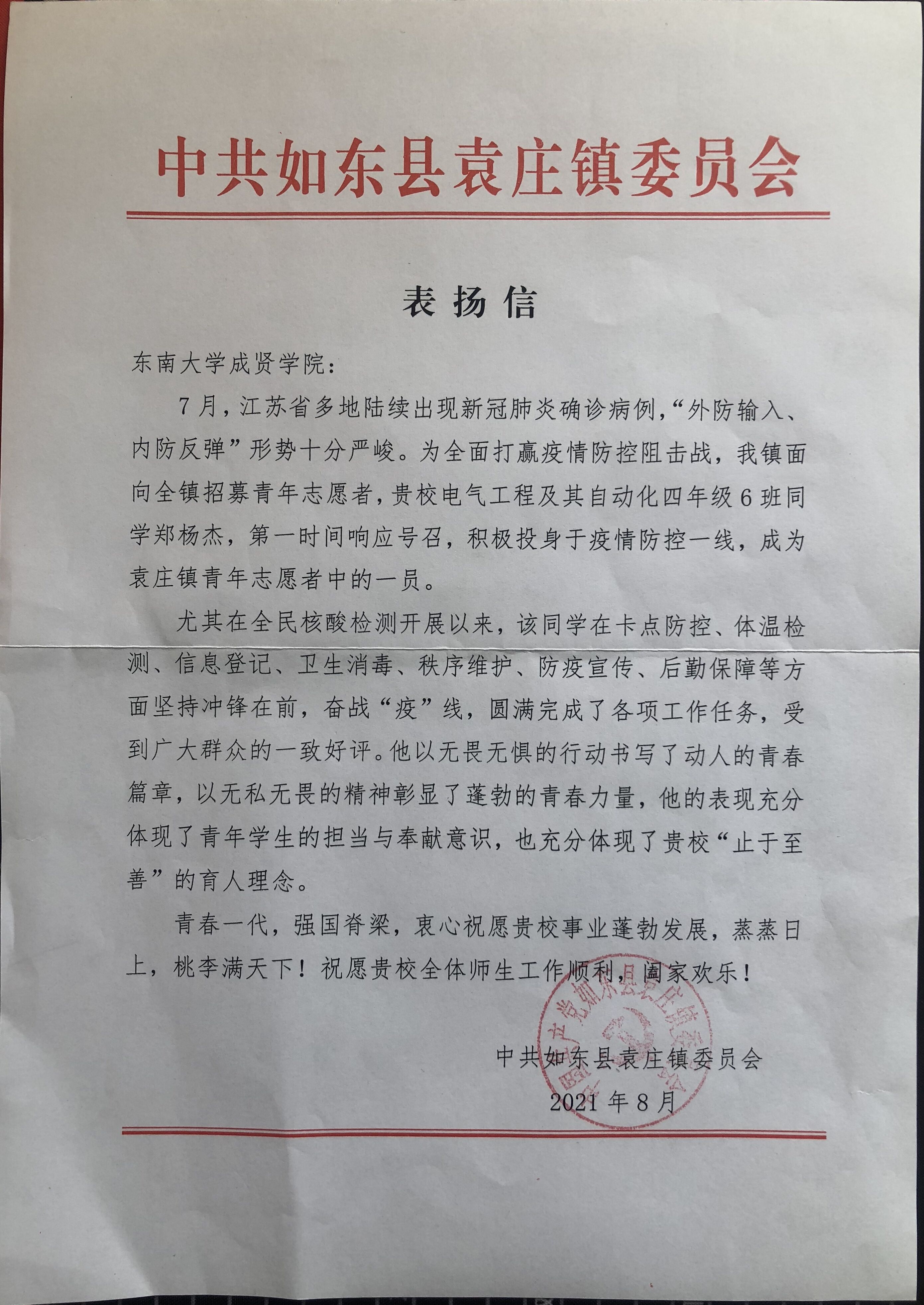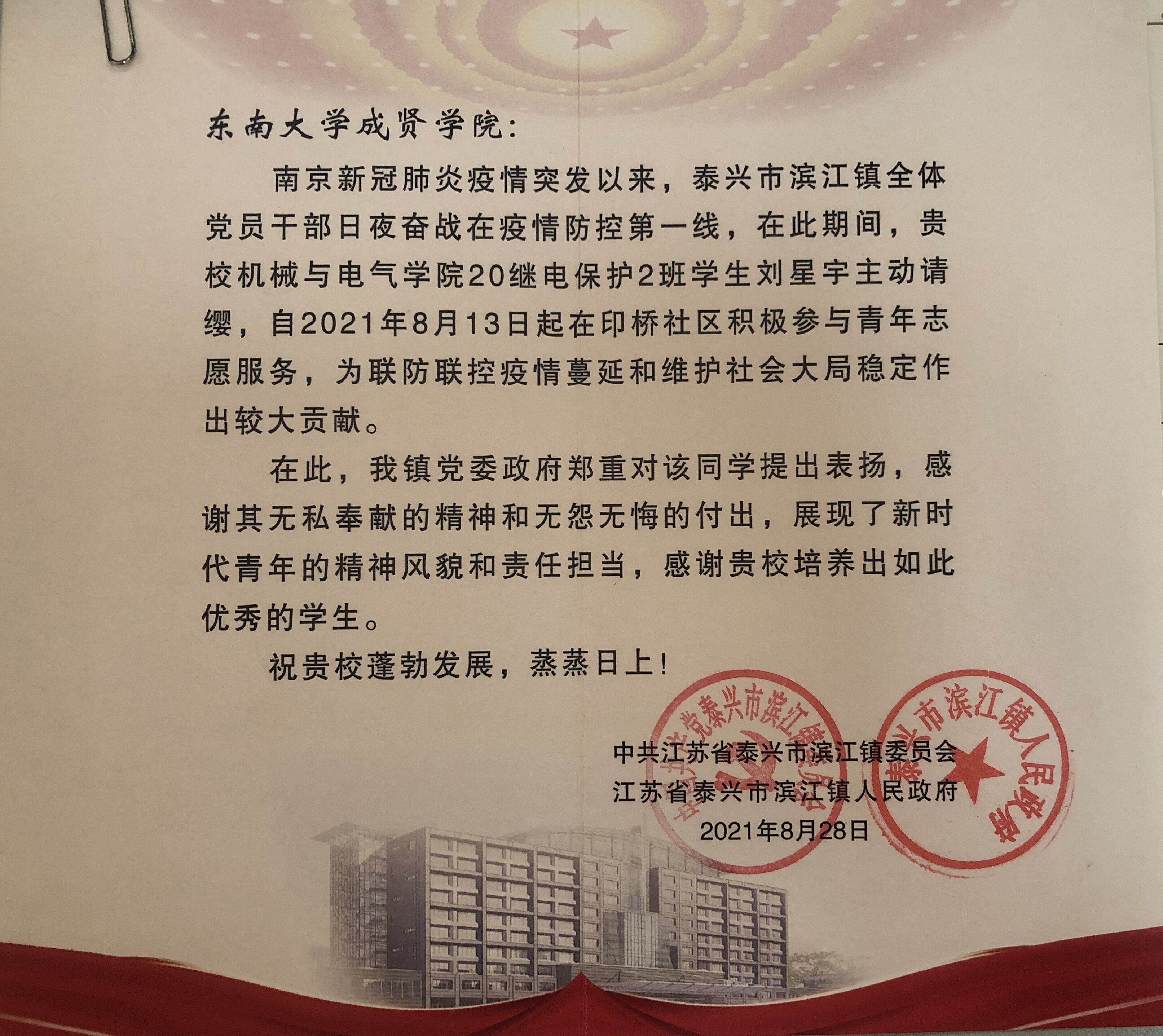 新冠肺炎防控工作开展期间,公司多名员工积极投身家乡抗“疫”一线,冲锋在前、积极奉献,用实际行动赢得了家乡人民的认可,所在社区纷纷向公司发来感谢信或对个人进行表彰,彰显了公司青年学子主动作为,敢于担当的优良品格。