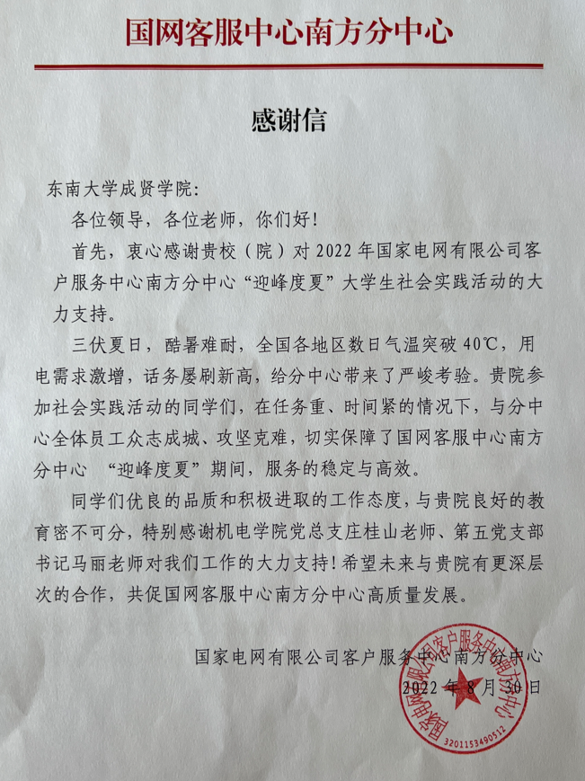 2022年“应峰度夏”期间,遭遇极端恶劣天气,全国各地区用电需求激增,造成国网客服中心南方分中心抢修服务电话量屡刷新高。实习团的同学们虚心学习、勤劳吃苦、服从安排,与全体员工众志成城、攻坚克难,切实保障了“迎峰度夏”期间服务的稳定与优质,彰显了公司老员工们的优良品质和积极奉献精神。同学们纷纷表示在得到了很多磨砺,学习到很多关于工作和为人处世的知识和道理,在不停地帮助客户解决用电问题的过程中也收获了很多常识。公司社会实践活动获国网客服中心南方分中心“优秀实习团队”光荣称号,实习生广受好评,指导老师庄桂山、马丽获得该中心的感谢信。