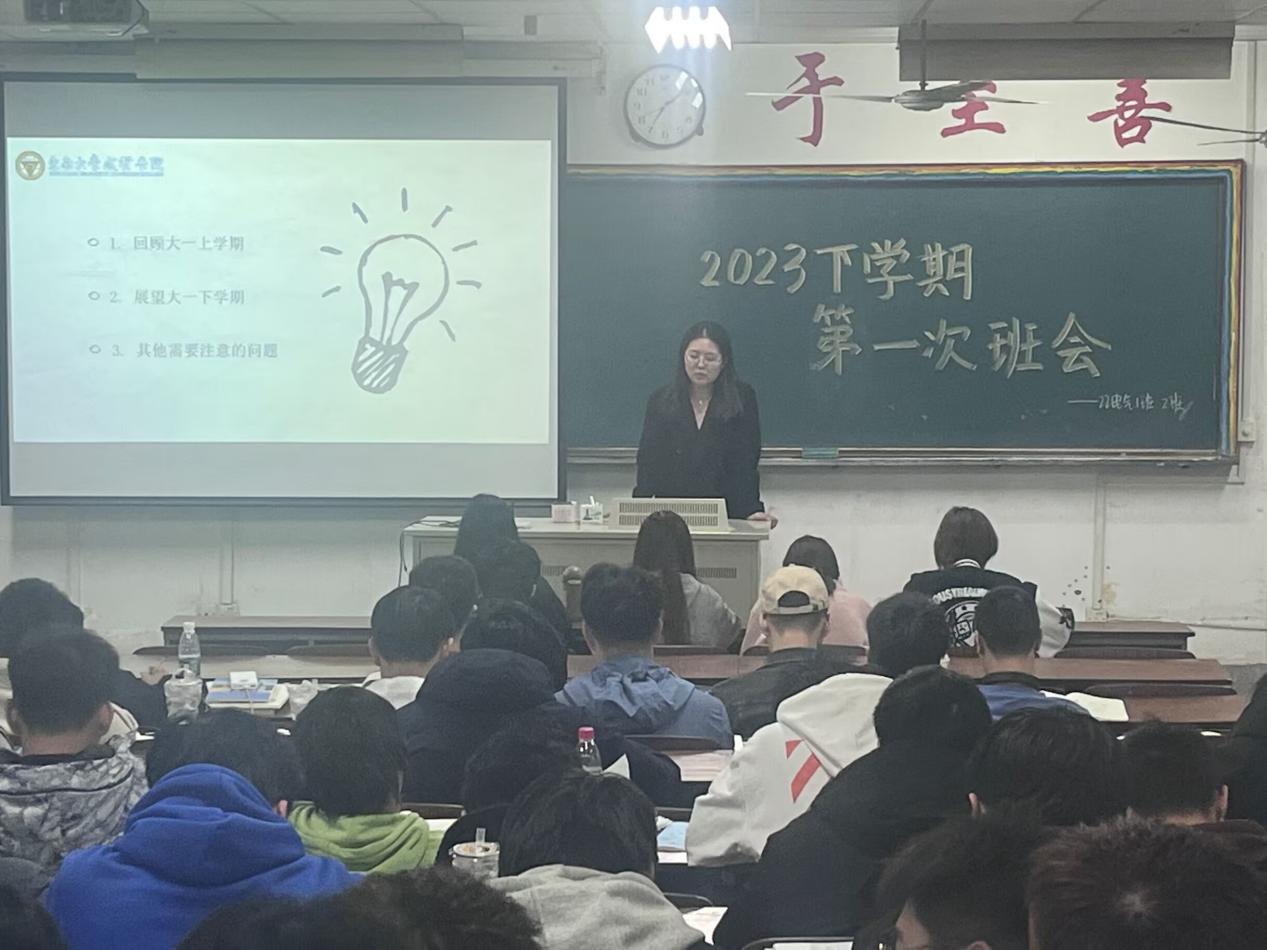 班会期间,辅导员老师就上学期各班学习情况进行了总结,并对未来学习及生活规划做出了建议和要求。首先针对学业问题,对上学期期末考试情况进行了总结,并指出同学们在接下来的学习生活中仍有待改进的一些问题,比如晚自习、上课期间玩手机;结合本学期课程特点,着重强调了本学期应引起重视的课程,并建议同学们在认真学习本专业课程的基础上,继续备考四六级和计算机二级证书;其次针对宿舍生活,舍友之间的相互包容、融洽相处能够为同学们的学习生活提供了基础保障,所以辅导员老师指出舍友之间应该尽量避免冲突,大家也应该相互促进,杜绝在宿舍内酗酒、赌博等不良行为;最后结合“帮信罪”、“杀猪盘”、“刷单”等网络诈骗名称进行了特别强调、希望同学们以学业注重的同时、谨防网络受骗。辅导员老师也详细介绍了团内推优、专业分流等近期工作安排,并再次强调大家在日常生活中应该继续提高身体安全、心理健康意识,当好自身安全的第一责任人。本学期各类活动也会陆续开展,因此辅导员老师也鼓励同学们积极参加各类竞赛和活动,不断发展自己的兴趣爱好。