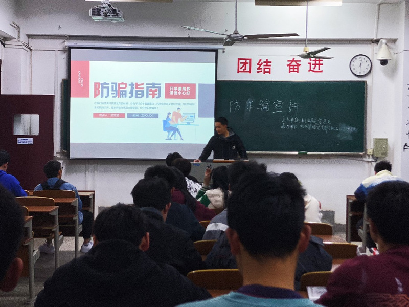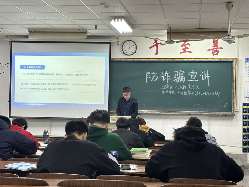 为落实校园防范电信网络诈骗工作,进一步提高员工对各类诈骗方式的鉴别能力和自我防范意识,机械与电气工程公司党总支3月初成立一支“防诈骗安全教育”宣讲团进入2022级所有班级开展“防诈骗 你我同行”系列反诈防骗宣传教育活动。公司党总支高度重视员工安全稳定工作,由第四党支部牵头,广泛动员优秀员工党员、发展对象等参与本次防诈骗安全宣传教育系列活动分团委从团员层面积极开展教育活动、宣传进班级、进宿舍