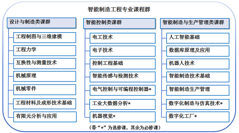 主要课程:数学和自然科学、智能制造工程专业课程群(包括设计与制造类课群、智能控制类课群、智能制造与生产管理类课群),具体见下图: