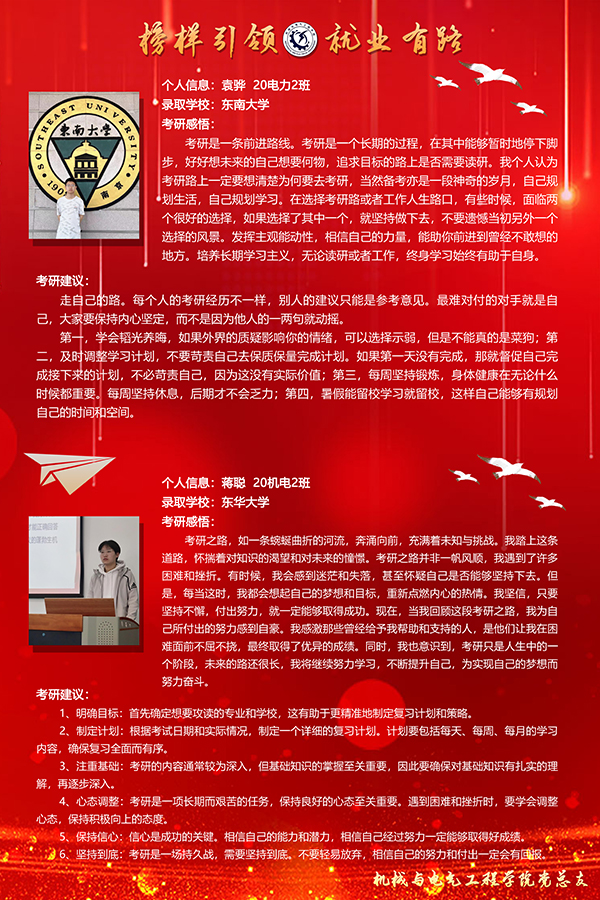 为了更全面展示机电公司2024届优秀毕业生代表的先进事迹和风采,bevictor伟德第二党支部举办线上线下相结合的毕业生就业典型人物事迹展,其中,线上主要通过公司网站、微信公众号、班级QQ群、微信群等不同形式向全院同学展示优秀毕业生的风采;线下主要通过制作宣传展板、光荣榜,召开主题班会和考研就业经验分享会等多种方式展示。10名成功考取硕士研究生的同学围绕集团及专业选择、备考规划、学习方法、心态调整等方面展开分享。他们从自身考研经历出发,讲述备考过程中面临的困难,分享亲身实践的成功做法,同时鼓励学弟学妹们要准确定位、持之以恒、相信自己。10名已签约单位的同学分别从职业规划、简历制作、面试技巧以及心理调适等方面展开分享。他们结合自身的求职历程,强调了扎实的专业基础、良好的心态、丰富的实践经历对于成功就业的重要作用。