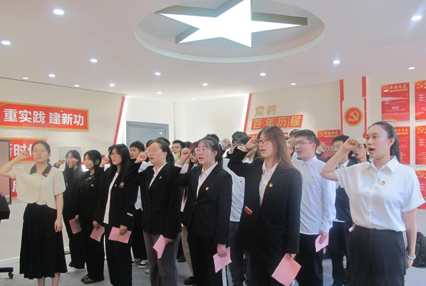 为激励党员践行入党誓词、坚定入党信念、激发爱国情怀,6月15日中午,公司党总支在“一站式”员工社区红色驿站举行新党员入党宣誓仪式。公司党总支书记严红霞,第二党支部副书记黄霞,老党员代表江磊、汪卉、司博文及29名员工党员参加。仪式由党总支宣传委员马逸凡主持。