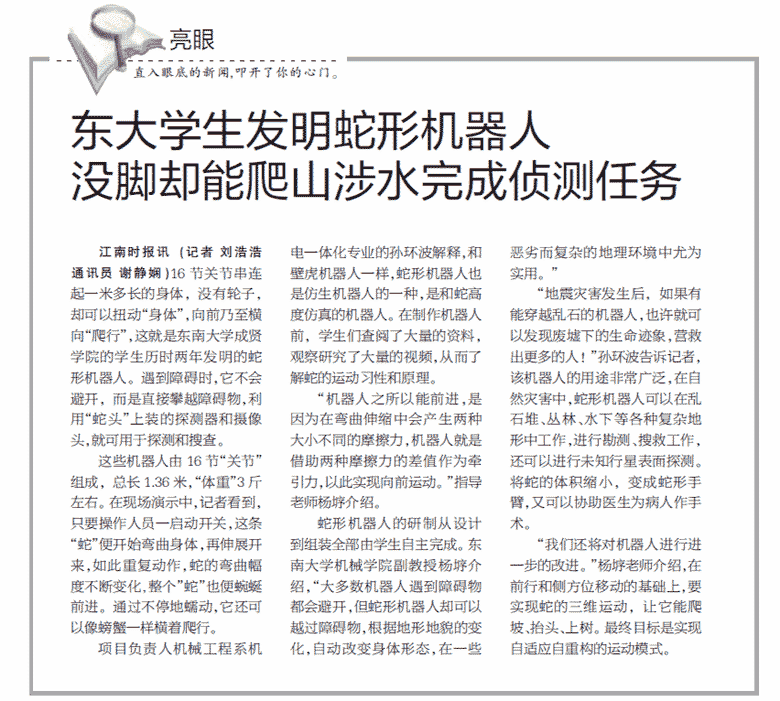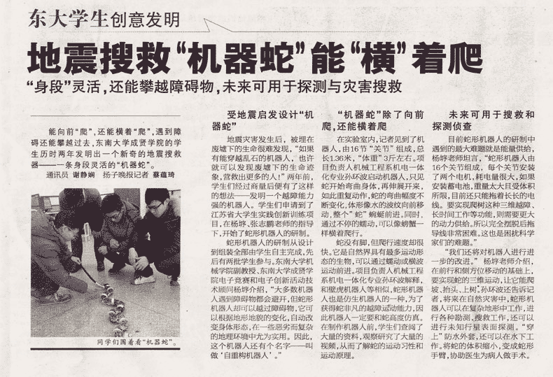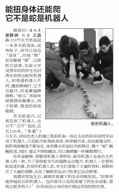 2013年,中国江苏网、扬子晚报、现代快报、南京晨报、江南时报等多家媒体,集中报道了孙环波主持设计的蛇形机器人。