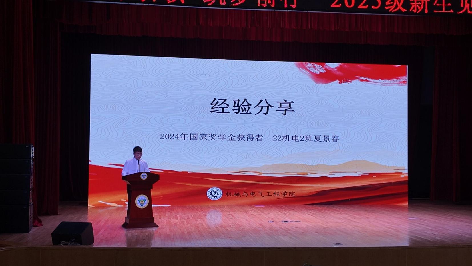 身边的榜样,前行的力量。国家奖学金获得者、2022级机械专业夏景春同学作为优秀员工代表发言。他分享了自己在专业学习、科技竞赛、员工工作等方面的成长历程与心得体会,以其真实动人的奋斗故事,生动诠释了“天道酬勤”的内涵,为新生们树立了可学可做的身边标杆。
